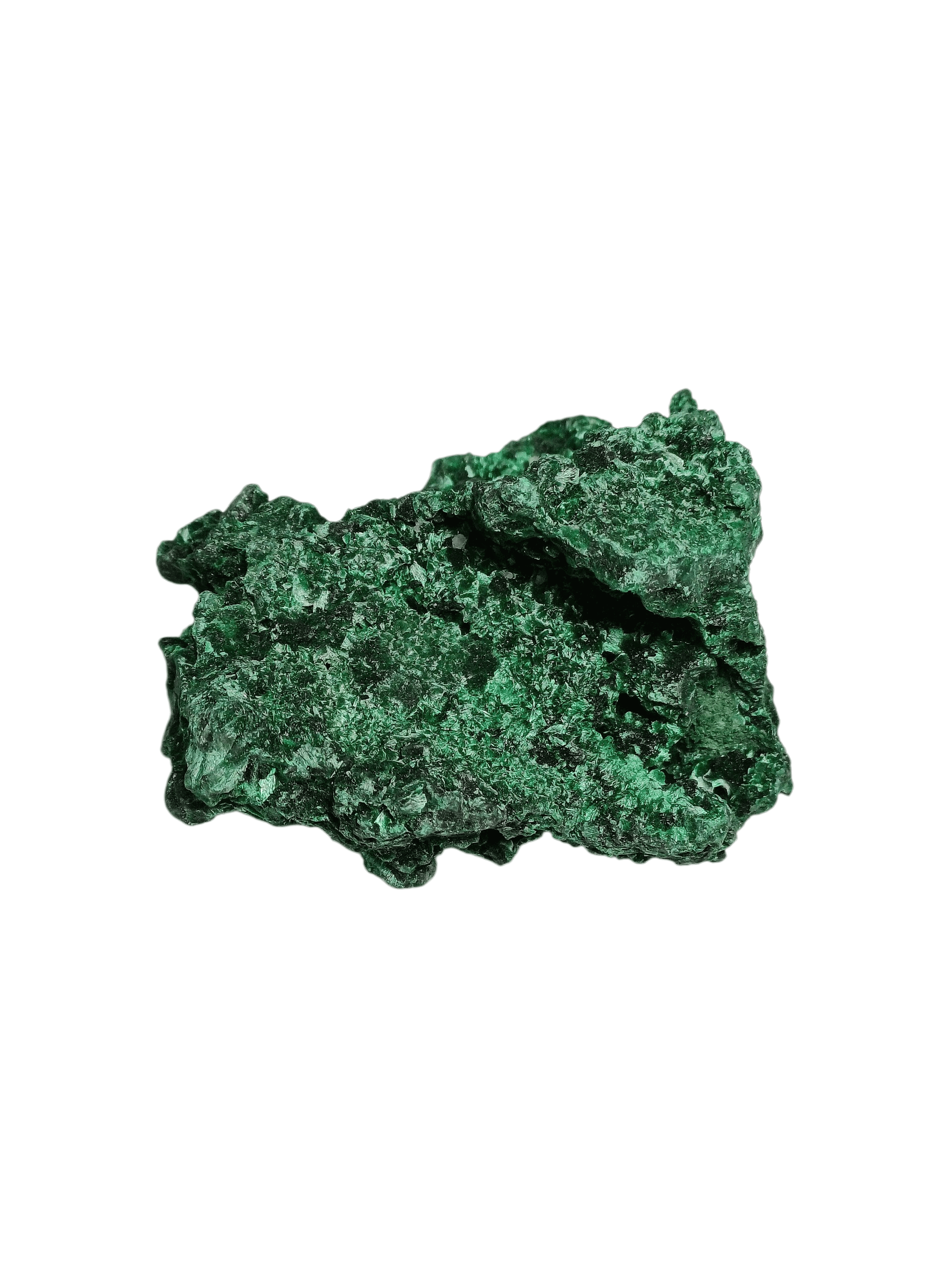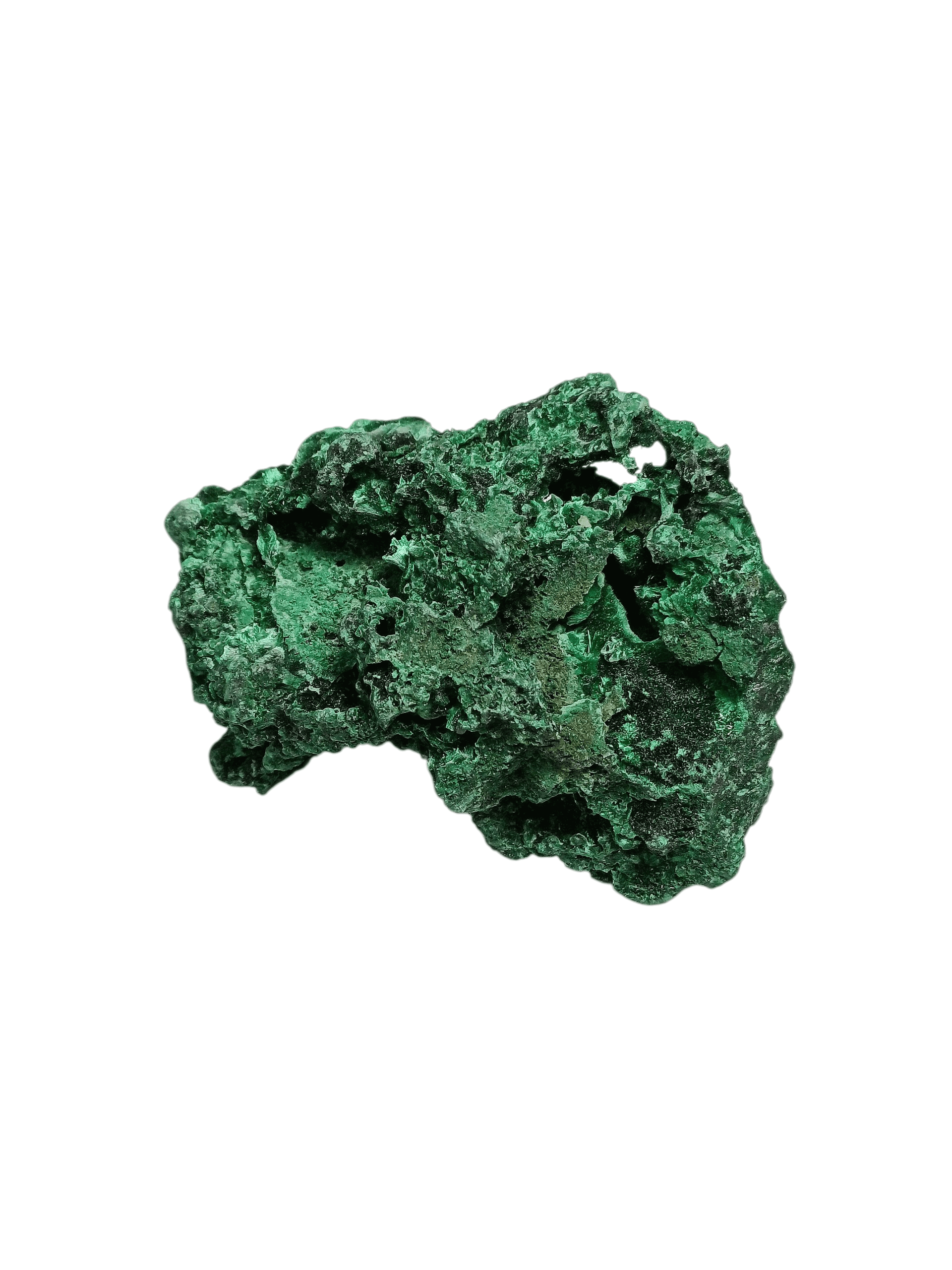 Натуральний необроблений малахіт з красивою гроноподібною структурою. Його поверхня складається з безлічі дрібних сферичних утворень, що створюють унікальний рельєф та живу текстуру каменю.
